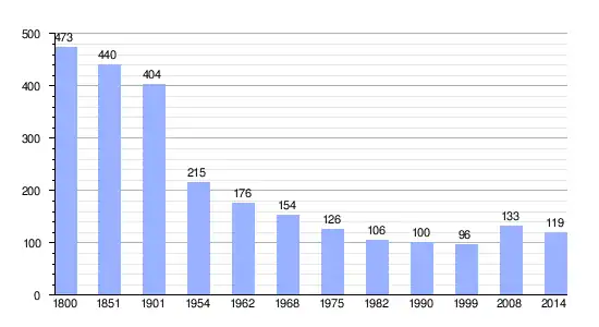 Los datos demográficos contemplados en este gráfico de la comuna de Chastel-sur-Murat[4] se han cogido de 1800 a 1999 de la página francesa EHESS/Cassini, y los demás datos de la página del INSEE.[5]