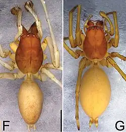 ![]() Ejemplares macho (F) y hembra (G) de Cheiracanthium auriculatum | ||