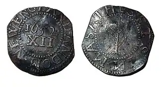 - De plata con año 1652 (la verdadera fecha más temprana era 1667) de 28 mm de diámetro con ceca de Boston, el anverso —con un pino— y el reverso —con número romano XII— semejantes a la de 3 peniques, y se reacuñó con misma fecha hasta 1684; todas las piezas de figuras de árboles fueron conocidas como las «monedas del pino».[2]