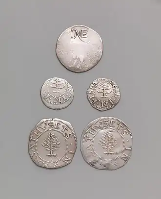 - De plata con año 1652 (la verdadera fecha más temprana era 1667) con ceca de Boston, el anverso —con un pino— y el reverso —con número romano VI— semejantes a la de 3 peniques, y se reacuñó con misma fecha hasta 1684; todas las piezas de figuras de árboles fueron conocidas como las «monedas del pino».[1] - 12 peniques (1 chelín) de plata de 1652 (sin fecha estampada) de 29 mm de diámetro con ceca de Boston, en el anverso con monograma semejante al anterior y en el reverso con el valor de peniques en número romano: XII, con varias reacuñaciones posteriores.[1]