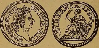 - De cobre con años de 1723 y de 1724 con ceca de Dublín de 20 mm de diámetro (sin figurar el valor, solo reconocible por el tamaño), en el anverso con rostro masculino y cabello largo, rizado y laureado con dos variedades de leyenda: GEORGIUS :D:G: REX. o bien GEORGIUS DEI GRATIA REX (Jorge, rey por la gracia de Dios), en el reverso hay una mujer caracterizada sentada de frente con cabeza girada a la izquierda por tocar el arpa, con leyenda: *HIBERNIA*(fecha)*, conocida como la «moneda de Hibernia».[36]