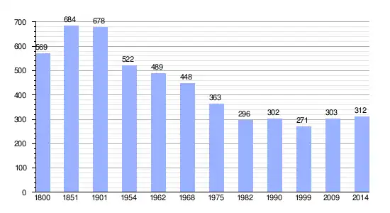 Los datos demográficos contemplados en este gráfico de la comuna de Chigné[4] se han cogido de 1800 a 1999 de la página francesa EHESS/Cassini, y los demás datos de la página del INSEE.[5]