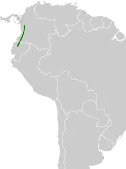 Se la encuentra en Colombia, Ecuador, y Panamá. Su hábitat natural son los bosques bajos húmedos subtropicales o tropicales y los bosques montanos húmedos subtropicales o tropicales.