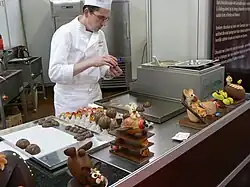 Una de las épocas en que los chocolateros se lucen con sus creaciones es la Pascua, momento en que las bombonerías exhiben al público sus mejores innovaciones. La tradición establece que en este periodo se consumen bizcochos con cobertura de mantequilla o de crema con frutas escarchadas o bien los tradicionales huevos de Pascua en las más diversas combinaciones y tamaños. Sin embargo, la modernidad está dando pasa a la recreación de todo tipo de figuras de moda.[5]