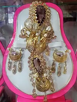 - Accesorios: Para las festividades y eventos sociales se usan ostentosos accesorios de oro, plata o platino. Estos son: aretes, ramilletes en los sombreros, anillos y topos estos últimos de origen prehispánico.