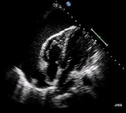 La ecocardiografía también evalúa por las causas de choque obstructivo. Detecta un derrame pericárdico con facilidad.[24][25] Además, en el taponamiento cardíaco, se puede ver el colapso de las cámaras del corazón.[20] En el caso de embolia pulmonar masiva o submasiva, se vería el ventrículo derecho dilatado. Otros signos ecocardiográficos son coágulos en el corazón derecho y el movimiento paradójico del tabique interventricular. Al otro lado, la angiografía por TC es la prueba preferida para diagnosticar la embolia pulmonar.[12]