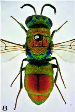 - ↑ a b c d e f g h i Arens, Werner (19 de diciembre de 2016). «Zwei neue Goldwespen-Arten von griechischen Ägäis-Inseln (Hymenoptera: Chrysididae)». Linzer biologische Beiträge 48 (2): 989-997. doi:10.5281/zenodo.5281006. Consultado el 21 de agosto de 2025.