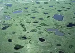 Los baches de las praderas se encuentran en las zonas del norte de Norteamérica como la Región de los baches de las praderas. Estos paisajes estuvieron antaño cubiertos por glaciares, por lo que se formaron depresiones poco profundas en gran número. Estas depresiones se llenan de agua en primavera. Constituyen importantes hábitats de reproducción para muchas especies de aves acuáticas. Algunas charcas sólo se producen estacionalmente, mientras que otras retienen suficiente agua para estar presentes todo el año.[17]
