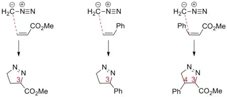 En el ejemplo, se considera la cicloadición de diazometano a tres dipolarófilos: acrilato de metilo, estireno o cinamato de metilo. El carbono del diazometano tiene el orbital HOMO más grande, mientras que los carbonos olefínicos terminales de acrilato de metilo y estireno tienen el mayor LUMO. Así, la cicloadición da la sustitución en la posición C-3 regioselectiva (en la figura los números en rojo son los localizadores del anillo de pirazolina). Para el cinamato de metilo, los dos sustituyentes (Ph vs COOMe) compiten en la retirada de electrones al alqueno. El carboxilo es el mejor grupo de retirada de electrones, causando que el β-carbono sea el más electrofílico. Por lo tanto, cicloadición se obtiene el grupo carboxilo en C-3 y el grupo fenilo en C-4 regioselectiva.