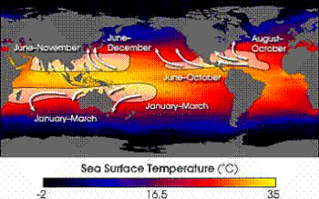 En el Atlántico Norte, la temporada de huracanes se extiende desde el 1 de junio hasta el 30 de noviembre, alcanzando su punto álgido entre finales de agosto y octubre.[24] El pico estadístico de la temporada de huracanes en el Atlántico Norte es el 10 de septiembre.[25] El Pacífico Nororiental tiene un periodo de actividad más amplio, pero en un marco temporal similar al del Atlántico.[24] En el Noroeste del Pacífico hay ciclones tropicales todo el año, con un mínimo en febrero y un pico a principios de septiembre.[24] En la cuenca del Índico Norte, las tormentas son más frecuentes de abril a diciembre, con picos en mayo y noviembre.[24]