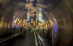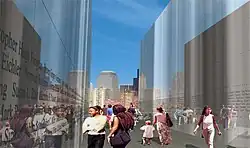 Algunos observadores señalaron que el monumento "recuerda al monumento conmemorativo de la guerra de Vietnam de Maya Lin en Washington",[7] con sus paredes llenas de nombres, enumerados al alcance de la mano y grabados lo suficientemente profundos como para que sea posible frotar las manos, pero uno de los muchos Las diferencias entre ese diseño y este serán la forma en que el monumento conecta visualmente a Nueva Jersey con el skyline de Nueva York, con los muros conmemorativos que simbolizan las torres gemelas derribadas al otro lado del río Hudson.