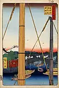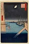 4. Tsukudajima y el puente Eitaibashi (永代橋佃しま Eitaibashi Tsukudajima?) (2-1857) | Aquí se introduce una visión nocturna, donde se percibe un muelle de la pequeña isla de Tsukuda, en la bahía de Edo, vista desde el puente Eitaibashi («Puente de la Eternidad»), perceptible en un amplio pilar que ocupa el lateral izquierdo. Este puente, construido en 1698, era el más largo de Edo, y atravesaba el río Sumida, el principal río de la ciudad. La isla era un puerto pesquero que tenía el encargo oficial de suministrar pescado fresco al shōgun. En las noches de invierno y primavera se pescaba shirauo («pez blanco»), al que atraían con antorchas, como la que se puede ver en este cuadro.[19] | |||||||