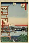 56. El puente Mannenbashi en Fukagawa (深川萬年橋 Fukagawa Mannenbashi?) (11-1857) | Se muestra nuevamente una escena enmarcada por la estructura del puente y la madera de un barril, del que pende colgada de una cuerda una tortuga puesta a la venta. Esta composición da paso a un paisaje formado en su parte central por el río Fukagawa, plagado de isletas con juncos y navegado por varias barcas, destacando la parte superior de un remero en el ángulo inferior derecho. Al fondo, en el centro de la lámina, se alza imponente el monte Fuji. Esta escena tiene un claro simbolismo, contraponiendo el comercio mundano representado por la tortuga en venta con el valor sacro y eterno del monte Fuji, concepto que queda remarcado por el significado del puente Mannenbashi: «puente de los diez mil años». A su vez, la tortuga es símbolo de longevidad.[70] | |||||||