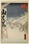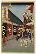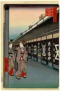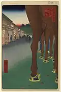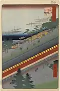 13. Shitaya Hirokōji (下谷広小路 Shitaya Hirokōji?) (9-1856) | Se ve una panorámica de la calle Hirokōji («Calle ancha»), que conducía al templo de Kan'ei-ji en Ueno, cuyo recinto se vislumbra en el punto de fuga de la calle, en un bosque inmerso en la neblina. Entre la gente de la calle destaca un grupo de samuráis y una larga procesión de mujeres cubiertas con sombrilla. En primer plano de la calle, en el lado derecho, destaca el edificio de los almacenes Matsuzakaya –aún existente en el mismo sitio–, dedicado al comercio textil, recién reconstruido tras su completa destrucción en el terremoto de 1855.[28] | |||||||