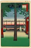 10. Amanecer en el santuario Kanda Myōjin (神田明神曙之景 Kanda Myōjin akebono no-kei?) (9-1857) | Si en la lámina anterior se veía el santuario a lo lejos, ahora el autor se sitúa en su propio recinto, en una terraza que ofrece una panorámica de los tejados de la ciudad, inmersos todavía en la oscuridad, mientras al fondo amanece. En primer plano se sitúa un alto y majestuoso cedro, que da una visión de verticalidad a la composición. Tras él se perciben las figuras de un sacerdote, una sirvienta del templo y su ayudante, con vestidos de vivos colores. El santuario Kanda Myōjin fue construido en 730, y era sede de unas fiestas patronales en las que la población de Edo entraba en procesión en el palacio del shōgun.[25] | |||||||