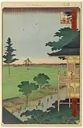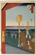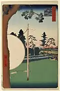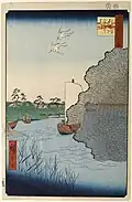 40. La ermita de Bashō y la colina de las camelias junto al acueducto de Sekiguchi (せき口上水端はせを庵椿やま Sekiguchi jōsuibata Bashōan Tsubakiyama?) (4-1857) | La ermita estaba dedicada al gran poeta Matsuo Bashō, y fue construida por sus discípulos en el cincuenta aniversario de su muerte, en 1743. Se encontraba en Tsubakiyama («colina de las camelias»), propiedad de la familia Hosokawa (a la que pertenece Morihiro Hosokawa, primer ministro de Japón entre 1993 y 1994). El acueducto de Sekiguchi era de los principales suministros de agua de la ciudad, y se mantenía con un impuesto anual que pagaban todos los habitantes. Por el camino deambulan pequeñas figuras, como es habitual en las composiciones de esta serie, para otorgar un factor humano al paisaje.[54] | |||||||