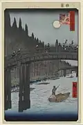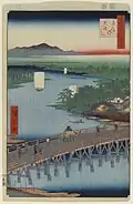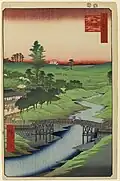 45. El puente Yatsumi no hashi (八ツ見のはし Yatsumi no hashi?) (8-1856) | Yatsumi no hashi quiere decir «vista de los ocho puentes», pues desde allí (actualmente es el Puente Ichikoku) se podían ver ocho puentes seguidos a lo largo del río. Nuevamente el autor antepone un primer plano en el costado derecho con unas ramas colgantes de sauce llorón, mientras que en la esquina inferior izquierda aparecen unos travesaños del puente. En plano medio se ve el río surcado por varias embarcaciones, tras el cual se suceden diversos puentes que se pierden en la lejanía. Los edificios del fondo corresponden al palacio del Shōgun, detrás del que se yergue la imponente majestuosidad del monte Fuji. El cielo tiene la habitual gradación de colores, atravesado por el vuelo de dos pájaros.[59] | |||||||
