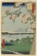 39. El templo Kinryūzan en Asakusa y el puente de Azumabashi desde lejos (吾妻橋金龍山遠望 Azumabashi Kinryūzan enbō?) (8-1857) | Se aprecia de nueva una insólita visión donde el paisaje es atravesado por una embarcación de recreo que, sin embargo, está cortada a ambos extremos, vislumbrándose a la izquierda el peinado y el vestido de una geisha de la que no se ve el rostro. Al fondo se ve un muelle y un conjunto de casas de las que sobresale el templo de Kinryūzan («templo del dragón dorado», actual Sensō-ji), al lado de cuyo edificio principal se yergue una pagoda de cinco pisos. Más lejano se eleva el nevado monte Fuji. En toda la composición flotan unas hojas de cerezo, dando un tono poético a toda la estampa, en el que se percibe el contraste entre lo efímero y lo eterno: las efímeras hojas frente al eterno Fuji, el efímero amor de la geisha frente al eterno misticismo del templo.[53] | |||||||