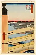 6. El picadero de Hatsune no baba en Bakuro-chō (馬喰町初音の馬場 Bakuro-chō Hatsune no baba?) (9-1857) | El picadero de Hatsune no baba –el más antiguo de Edo– se ve a través de una insólita perspectiva, a través de unas telas puestas a secar por los tintoreros del vecino barrio de Kon'ya, cuyos colores blanco, ocre y violeta armonizan con el cielo de fondo. Sobre los pabellones del picadero sobresale una torre de bomberos que daba servicio a toda la zona, un elemento familiar para Hiroshige, que había heredado el cargo de capitán de bomberos de su padre en 1809, y que a su vez legó a su hijo en 1832 para dedicarse de lleno a la pintura.[21] | |||||||