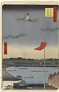 62. El pabellón Komakatadō y el puente Azumabashi (駒形堂吾嬬橋 Komakatadō Azumabashi?) (1-1857) | El pabellón Komakatadō aparece en el ángulo inferior izquierdo, apenas esbozado en un saledizo de su techumbre. En su día conservaba una imagen del bodhisattva Kannon con cabeza de caballo (Batō Kannon). Desde esta panorámica se alza un alto mástil con una bandera roja, presumiblemente de un comercio de cosmética. Al fondo se abre el río Sumida, con el barrio de Asakusa al fondo y el puente Azumabashi a la izquierda, encima del tejado del templo. El cielo está cubierto, y parece lloviznar, mientras que un ave hototogisu («cucú japonés») pasa volando apresuradamente. La conjunción del ave y el templo hace referencia a un conocido poema de amor del teatro kabuki: la cortesana Takao (1640-1659), amante del daimyō de Sendai, Date Tsunamune, murió consumida de amor, pronunciando estos versos: «¿Habéis venido ya, mi señor, hasta Komakata? ¡Oíd la llamada del hototogisu!» (Kimi wa ima, Komakata atari, Hototogisu).[76] | |||||||
