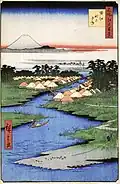 70. La desembocadura del río Nakagawa (中川口 Nakagawaguchi?) (2-1857) | El protagonista de la estampa es el río, que domina la composición en su eje vertical, así como en su zona central. El Nakagawa es el que transcurre horizontalmente, desembocando a la derecha en la bahía de Edo, fuera de esta imagen. Aparecen en sus aguas varias barcas de pescadores y unas balsas de madera transportadas por remeros. El tramo inferior, por el que navegan dos barcas de pasajeros, es el canal Onagigawa, donde había un puesto de control militar. En el extremo opuesto se ve el canal Shinkawa, con unas barcas cubiertas de paja que transportaban sal, que se producía en las inmediaciones. Este canal se pierde en la lejanía entre una espesa neblina de color blanco, graduada en ichimonji bokashi.[84] | |||||||