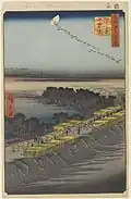 36. Vista desde la región de Massaki al bosque del santuario de Suijin, la pequeña ensenada del Uchigawa y al pueblo Sekiya no sato (真崎辺より水神の森内川関屋の里を見る図 Massaki atari yori Suijin no mori Uchigawa Sekiya no sato wo miru zu?) (8-1857) | En esta estampa se percibe con intensidad el gusto del autor por las perspectivas insólitas, mostrándose el paisaje a través de una ventana cortada por la mitad por una puerta corredera, tras la que aparece una rama de ciruelo. Probablemente se trate de una casa de té, y en la pared izquierda se ve parcialmente un jarrón con una flor de magnolia. La vista ofrece una panorámica de la región de Massaki, al norte del barrio del placer de Shin-Yoshiwara, circundado por el río Sumida, que es transitado por varias embarcaciones. En el bosque de la derecha aparece el torii del santuario de Suijin, que aparecía en la estampa anterior. Al fondo se ve el Tsukubasan, y atraviesa el cielo una bandada de pájaros.[50] | |||||||