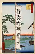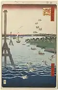 29. El santuario de Moto-Hachiman en Sunamura (砂むら元八まん Sunamura Moto-Hachiman?) (4-1856) | Del santuario del título solo se puede ver un torii (arco sagrado), en la esquina inferior derecha, mientras que se percibe a vista de pájaro un amplio paisaje con un dique que atraviesa diagonalmente la parte inferior, así como la bahía de Edo surcada de veleros en la superior. La vegetación está compuesta nuevamente de cerezos en flor y altos pinos, así como extensos juncales en la zona adyacente a la bahía. Sunamura era una zona recientemente drenada para aprovechar un terreno antes pantanoso, debido al rápido crecimiento de la ciudad; actualmente forma parte del distrito Kōtō-ku de la capital. Esta lámina revela cierta influencia de la pintura erudita china, que Hiroshige conoció a través de uno de sus maestros, Ōoka Unpō.[44] | |||||||