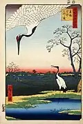 64. Jardín de lirios en Horikiri (堀切の花菖蒲 Horikiri no hanashōbu?) (i5-1857) | Como indica el título, se aprecian en primer plano, casi a ras de tierra, unos lirios, cuyas magníficas flores se abren hacia el cielo. Se trata de la especie shōbu floreciente, que fue traída por primera vez a Europa en 1712 por Engelbert Kaempfer, por lo que aquí se denominó iris kaempferi. Esta flor tuvo mucho éxito sobre todo durante el modernismo, sirviendo de elemento decorativo en muchas obras ornamentales modernistas. En Japón, esta flor se asociaba a la belleza femenina, lo cual queda reflejado en la imagen por las mujeres que se ven en plano medio, casi como con cierto voyeurismo.[78] | |||||||