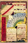 0. Índice | Fue obra de Baisotei Gengyo, a petición del editor tras la muerte del artista –su sello, de forma romboidal, se encuentra situado en la parte inferior a la derecha–. En la parte superior aparecen dos rectángulos donde figuran los títulos de las láminas dedicadas a la primavera, los más numerosos (42); debajo, en forma de abanico, aparecen las estampas del verano (30); los dos rectángulos inferiores se refieren al otoño (26) y al invierno (20). En la cartela roja de la izquierda aparece el título de la serie y el nombre Ichiryūsai Hiroshige –uno de los primeros nombres artísticos del maestro–, y se dice que es su obra más representativa (issei ichidai); también aparece el nombre del editor, Sakanaya Eikichi, y su dirección, Tōeizan Hirokōji. El fondo presenta motivos alusivos a las estaciones: un ciruelo en flor para la primavera, un pájaro hototogisu («cucú japonés») y la luna para el verano, y un pajar con siete tipos de hierbas para el otoño y el invierno. La caligrafía está elaborada con un tipo de escritura dispersa denominado chirashigaki, propio de las antologías poéticas.[16] | |||||||