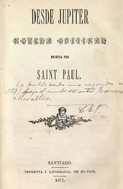 La práctica del género en Chile se inicia ya en el siglo XIX, con obras como ¡Una visión del porvenir! y El espejo del mundo en el año de 1975 (1875), obras ambas de Benjamín Tallman. La segunda cuenta con un subtítulo que la describe como: «Obra que contiene un misto de ciencia i novela, i con la que el autor se propone recrear a toda clase de lectores, tanto niños como jóvenes i otras edades, interesando su intelijencia en el progreso y adelanto material del mundo».[9] Así también, destaca Desde Júpiter: curioso viaje de un santiaguino magnetizado (1877), de Sain Paul, pseudónimo de Francisco Miralles. Esta producción se cuenta entre las primeras obras de ciencia ficción en español, publicadas durante el mismo periodo que Una temporada en el más bello de los planetas (1870-1871), del autor español Tirso Aguimana,[10] y Viaje maravilloso del señor Nic-Nac (1876), del argentino Eduardo Ladislao. La novela de Miralles puede considerarse parte de la tradición utópica, al tratar extensamente sobre la organización social y política de la civilización joviana, enfatizando estos aspectos por sobre la aventura de su protagonista.