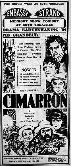 - ↑ Hall, Mordaunt (27 de enero de 1931). «Cimarron». The New York Times. Archivado desde el original el 10 de agosto de 2014. Consultado el 10 de agosto de 2014.