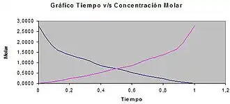 Uno de los factores más importantes es la concentración de los reactivos. Cuanto más partículas existan en un volumen, más colisiones hay entre las partículas por unidad de tiempo. Al principio, cuando la concentración de reactivos es mayor, también es mayor la probabilidad de que se den colisiones entre las moléculas, y la velocidad es mayor. A medida que la reacción avanza, al ir disminuyendo la concentración de los reactivos, disminuye la probabilidad de colisión y con ella la velocidad de la reacción. La medida de la rapidez de reacción implica la medida de la concentración de uno de los reactivos o productos a lo largo del tiempo, esto es, para medir la velocidad de una reacción necesitamos medir, bien la cantidad de reactivo que desaparece por unidad de tiempo, o bien la cantidad de producto que aparece por unidad de tiempo. La velocidad de reacción se mide en unidades de concentración/tiempo, esto es, en (mol/L)/s, es decir, mol/(L·s).