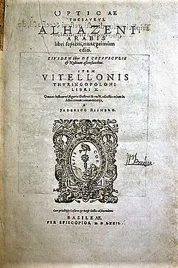 En 1021, Alhacén, un científico iraquí, experimentó con el mismo principio óptico descrito por Mozi, y escribió sobre los resultados en su Libro de Óptica, que proporcionó la primera descripción clara,[6] y el análisis correcto de la cámara oscura.[7] Su experimento de lámpara, donde varias fuentes de luz diferentes se disponen en un área grande, fue el primero de proyectar con éxito una imagen completa desde el exterior a una pantalla en el interior con la cámara oscura.[8]