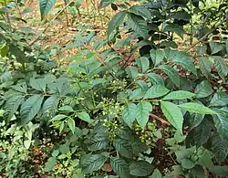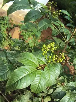 Es un árbol o arbusto, por lo general de 1-4 (-10) m de altura. Corteza gruesa. Las ramas jóvenes grisáceo marrón, acanaladas, cubierta con pubescencia amarilla y escasas lenticelas blancas grisáceas. Hojas de 8-30 cm, pecíolos y raquis cilíndrico, glabras o cubiertas con tricomas amarillos; foliolos por lo general 9-13, hojas opuestas, foliolos ovados a ovoide-oblonga, de 3.5-10 × 1.5-5 cm, basalmente más pequeños que en el ápice del raquis, papiráceas, ambas superficies cubiertas con adpreso pubescencia gris amarillento o envés pubescente sólo a lo largo de las venas y glabros adaxialmente, 8-10 nervios secundarios a cada lado del nervio central, base oblicua y redondeada, cuneadas, o ampliamente cuneada, margen serrado medio completo o apical, vértice acuminado agudo o mucronado. Inflorescencia de 8-15 cm, corimbosa; pedúnculo y ramas cubiertas de pubescencia amarilla. Flores de 3-4 mm de diámetro. Pedicelo 1-1.5 mm. Cáliz corto, fuera cubierto con pubescencia amarilla escasa. Pétalos blancos o amarillos, lineares a oblongo-elípticas, 2-3.5 mm, exterior cubierto con pubescencia rala. Fruta púrpura a negro al madurar, globosoa, de 4-5 mm de diam. Fl. De abril a octubre, fr. Agosto-Feb.[2]