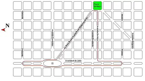 El trazado se iniciaba frente a la Biblioteca Nacional, sobre Av. del Libertador, giraba hacia el norte en la calle Tagle hasta Avenida Figueroa Alcorta, frente a los estudios de la Canal 7, continuaba frente a la Facultad de Derecho de la UBA hasta la horquilla en la intersección con calle Ayacucho, allí giraba hacia el sur continuando nuevamente por Av. del Libertador. La extensión del trazado es de 2760 metros.
