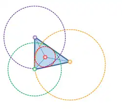 Cualquier triángulo se puede considerar circungonal con respecto a su círculo inscrito. Si además, todos sus ángulos son agudos (menores de 90 grados), se puede considerar circungonal con respecto a otras tres circunferencias. En el primer caso, el triángulo es la unión de los tres subtriángulos elementales que comparten el centro de la circunferencia. Para los otros tres círculos, el propio triángulo en su totalidad es un triángulo elemental circungonal |