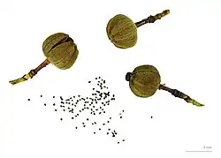 El fruto es una cápsula globosa con diez celdas en su interior.[2]