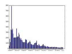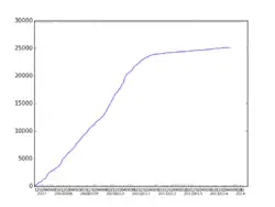 En abril de 2009 Citizendium mantenía una tasa constante de creación de nuevos artículos de alrededor de 13-14 por día y una disminución en el número de autores activos.[5] Citizendium, lanzado en marzo de 2007, en agosto de 2009 tenía 11.810 artículos, 2.999.674 menos que la versión en inglés de Wikipedia .[6] En marzo de 2010, el proyecto tenía 90 colaboradores que habían realizado al menos una edición, con un núcleo de 25 colaboradores que habían realizado más de 100 ediciones. La media del recuento de palabras se redujo de 468 palabras por artículo en octubre de 2007 a 151 en mayo de 2010.[7] En junio de 2010, el número de usuarios que realizaban 1, 20 o 100 ediciones por mes estaba en su punto más bajo desde que el proyecto se hizo público en marzo de 2007.
