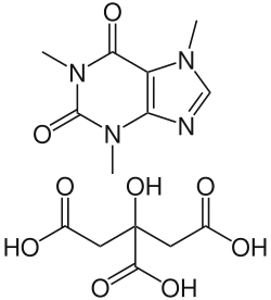 Los efectos secundarios pueden incluir problemas de alimentación, aumento del ritmo cardíaco, bajo nivel de azúcar en la sangre, enterocolitis necrotizante y problemas renales. En ocasiones se recomienda probar los niveles de cafeína en la sangre. Es una sal de ácido cítrico de la cafeína.[3] El citrato de cafeína se encuentra en la familia de medicamentos de la xantina. Funciona estimulando los centros respiratorios en el cerebro.