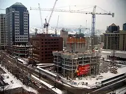 La barra de refuerzo se instaló en el sur de la Torre Key Bank recientemente reubicada, ubicada en el borde este del bloque ZCMI al este del bloque Crossroads a fines de julio de 2008. El resto del bloque ZCMI acababa de completar la preparación inicial del sitio. en este momento con la demolición de la parte restante del centro comercial ZCMI completado en enero de 2009.