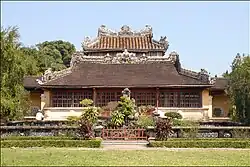 La biblioteca real (Thái Bình Lâu) fue construida en 1887 por el emperador (en la época de la Indochina francesa, las autoridades coloniales reconocieron solo el título de rey a los soberanos de la dinastía Nguyen ) Dong Khanh en el emplazamiento de un pabellón de lectura construido por Minh Mang en 1821. Está precedido por un pórtico y los laterales de su tejado están decorados con dragones. Delante de la biblioteca hay un jardín de rocas. Los visitantes también pueden admirar un pabellón mandarín cerca de la puerta principal, el único pabellón sobreviviente de este patio.