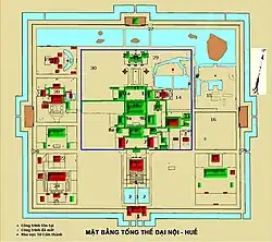 Esta parte de la Ciudad Imperial cubre un área de 10 hectáreas. Su perímetro es de 1229,36 m. La ciudad está rodeada por muros de 3,72 m altura y 0,72 m de grosor, y están perforados con siete aberturas. Sus edificios y numerosos patios fueron construidos a partir de 1802, bajo el reinado del emperador Gia Long, hasta 1833, bajo el reinado de su hijo, el emperador Minh Mang. La entrada principal, Dai Cung, fue construida en 1833.