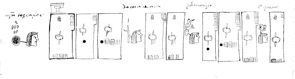 Hueyicitlalli o Citlalpol, representación de Venus en los códices.Lámina 54 del Códice Borgia donde se representan cuatro de las cinco manifestaciones de Venus con sus influjos cada 584 días.