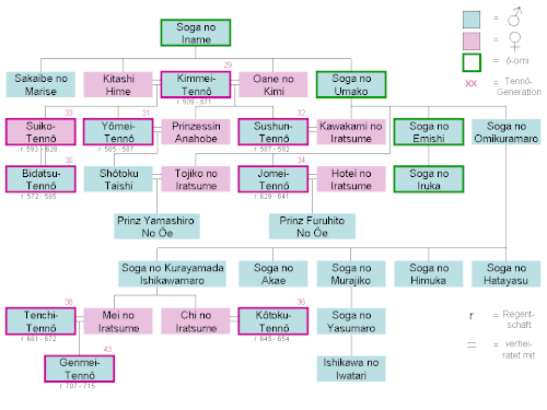 Soga no Iname sirvió de Gran Ministro desde 556 AD hasta su muerte en 570 AD, fue el primer miembro del Clan Soga en poseer una influencia dominadora sobre el trono imperial por medio de alianzas matrimoniales, casó a dos de sus hijas con el Emperador Kimmei, una de ellas sería madre del Emperador Yomei. Los siguientes cinco emperadores tendrían una esposa o madre descendiente de Soga no Imane.[1] De esta forma, el clan Soga unificaría y fortalecería el país poniendo al Emperador como un símbolo espiritual mientras ellos se encargaban todos los asuntos gubernamentales.