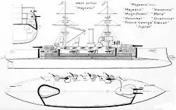 | HMS Magnificent | Astillero de Chatham | 18 de diciembre de 1893 | 19 de diciembre de 1894 | diciembre de 1895 |