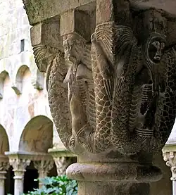 En el lado oeste en uno de los capiteles figuran en sus ángulos cuatro danzarinas dando la voltereta y entre medias un hombre con bigote, un joven imberbe, un músico tocando la viola y un obispo ante el altar. Otro capitel muestra la representación de las sirenas (o nereidas)[d] de doble cola, símbolo de los peligros del amor y la seducción sin control, más otra cara con la Natividad y otra con la Huida a Egipto. En este lado oeste hay un total de trece capiteles. Otro capitel con figuras humanas es considerado como el más interesante de todos. En otros se representa la Anunciación, el Nacimiento de Jesús, la Adoración de los Reyes y a la Virgen con el Niño en el regazo y San José a su lado. En el lado norte casi todos los capiteles están decorados con motivos vegetales pero hay uno en que pueden verse ocho personajes de pie en los que se llega a reconocer un báculo y un libro con una cruz delante. Otros capiteles tienen figuras humanas entremezcladas con motivos vegetales. En los lados este y sur los motivos son hojas de acanto, piñas y palmas o leones, sirenas, y otras aves.[4]