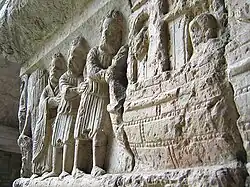 La ornamentación del friso del pilar intermedio representa la Anastasis o bajada de Cristo a los infiernos para librar las almas de los primeros padres. Sigue una representación de los condenados con un fondo de llamas y la figura de Satanás en posición arrogante. Las escenas son bastante llamativas como para infundir terror, como la de los dos hombres desnudos que se apuñalan mientras son envueltos por unas serpientes que al mismo tiempo muerden el pecho de unas mujeres en actitud y gesto de horror. La representación historiada se complementa con un caldero puesto sobre las llamas, que tiene dentro tres condenados, unos diablos y unos grifos monstruosos. El friso de la cara exterior no sigue el tema historiado sino que se adorna con un doble roleo y cinta perlada. Los capiteles de este pilar son historiados con temas del Nuevo Testamento, sin seguimiento narrativo ni orden cronológico. Se dan también los temas figurados. No hay ninguno de tipo corintio.[8]
