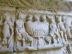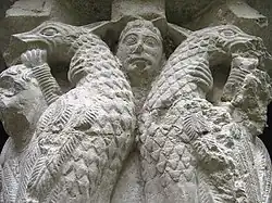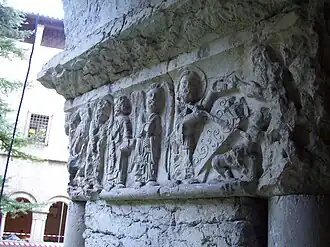 Los capiteles de las columnas desarrollan los temas del Nuevo Testamento; algún capitel hace una intrusión con Moisés y las tablas de la Ley. Estos capiteles siguen un ciclo narrativo de los episodios de la vida de Jesús; incluso en alguno se narra la parábola del rico Epulón que aparece lujosamente vestido y servido por un criado que le ofrece los manjares rodilla en tierra. En otra escena puede verse al mendigo Lázaro (no confundir con el Lázaro resucitado) que acaba de morir y es transportado por dos ángeles y recibido por Abraham.[7]