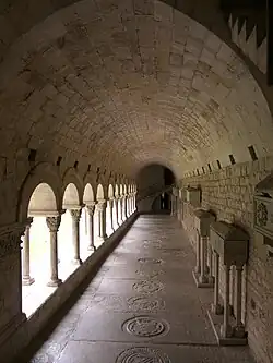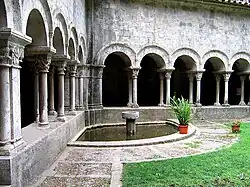 El primer recinto claustral debió construirse antes de 1117[b] aprovechando dos galerías edificadas en sillería, año en que un obispo llamado Berenguer firmó:
