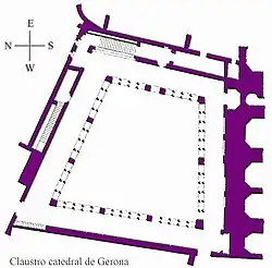 El claustro de la catedral de Gerona, emplazado en el lado norte de la iglesia, está considerado como uno de los más importantes de Cataluña (España).[1] Es obra del siglo XII, de planta irregular y en sus cuatro pandas o lados muestra arquerías románicas apoyadas sobre columnas que conservan los capiteles que han dado fama y categoría a la obra. Ha sido estudiado muy a fondo por los eruditos profesores Gerardo Boto Varela, Eduard Junyent y Carlos Sarthou Carreres quienes con sus descripciones editadas dieron a conocer todo el arte allí acumulado.